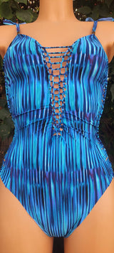 Clearance - One Piece Swimsuit For Women in Turquoise Stripes Print "SIDE" (Lycra Fabric)