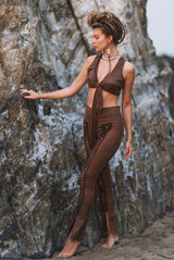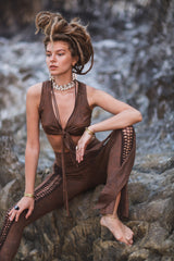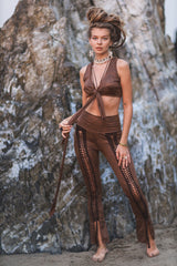 At the front of the leggings, there is a decoration of hand-braided cut-outs and knots, which give the leggings a unique look.