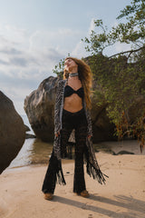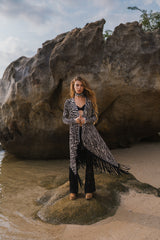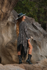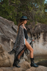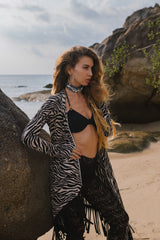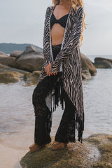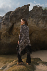 Cardigan in Black and White Print Decorated with Black Fringe
