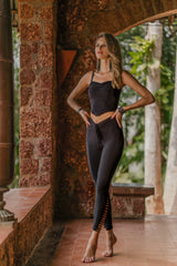 These beautiful leggings are made to move with you. On the side of the leg, there is a decoration of cuts & knots that give the legging its exclusive look. The waistband is flexible, the fabric is soft and stretchy, and the length is long enough.