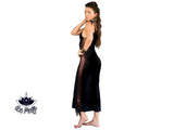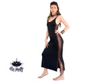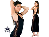 The front and the back are in Black and the side panels are in dark Brown decorated with cuts and knots all along the side of the dress, from top to bottom.