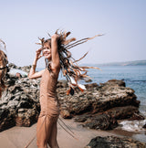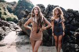 Mini dress decorated with hand-made cuts and knots in front and back and adjustable string on the sides that can make the dress shorter or longer as you wish.
