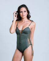Suede Look Olive Green One Piece Swimsuit For Women "SIDE"