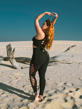 A beautiful tank top to wear for those warmer months of the year. The design of the top creates a unique pattern In front and back, with a decoration of cuts & knots that give the top its exclusive look. The cuts are tight & fit the body like a second skin.